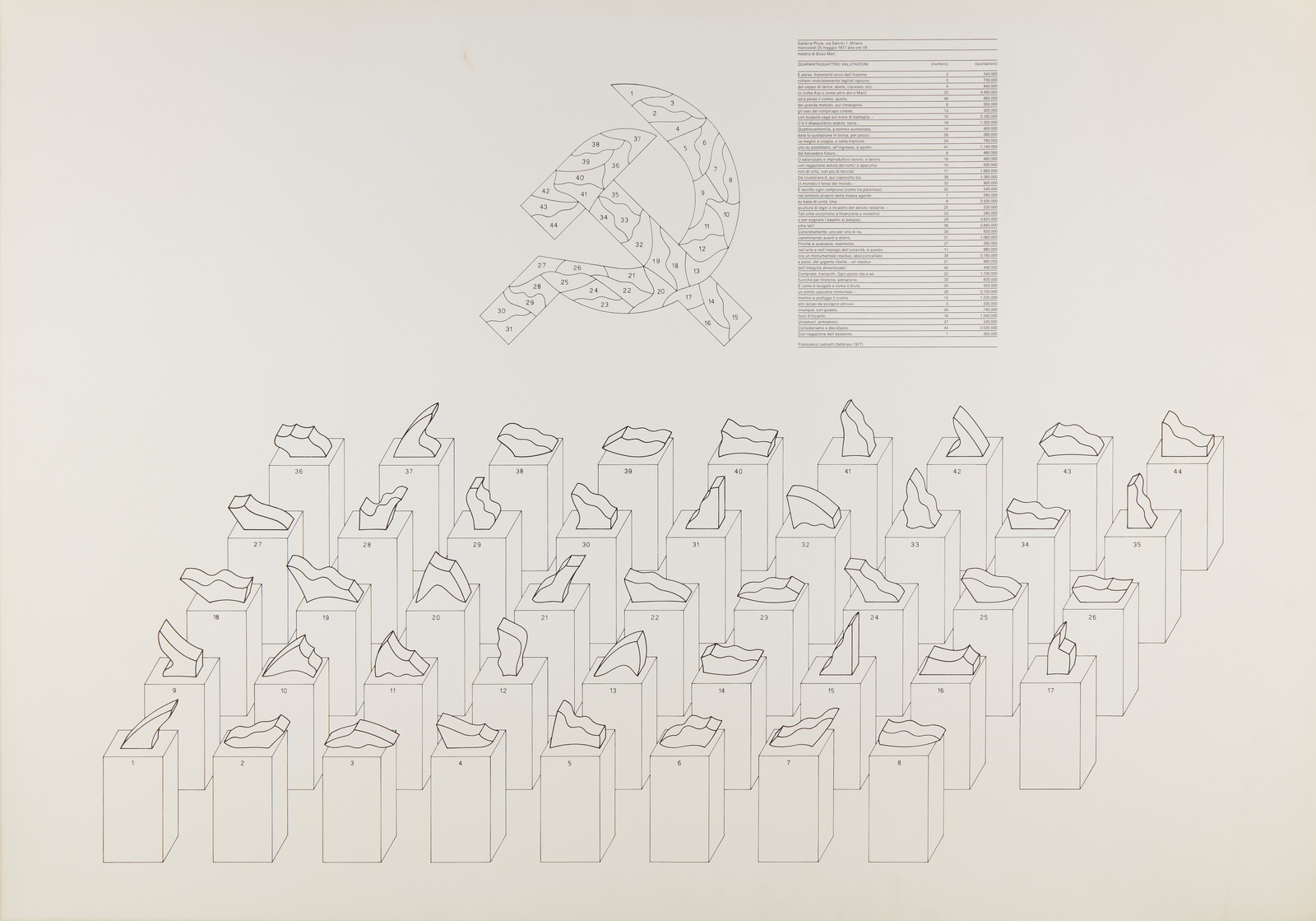 MARI ENZO (n. 1932) 44 valutazioni. 1977. Litografia. Cm 100,00 x 70,50. Titolo in alto a destra. Edizione totale: 150 esemplari. Edizione realizzata in occasione della prima mostra della serie di sculture "44 valutazioni", presso la Galleria Plura, Milano, il 25 maggio 1977, esposte poi alla Biennale di Venezia del 1978. Tiratura non presente. Lievi difetti.