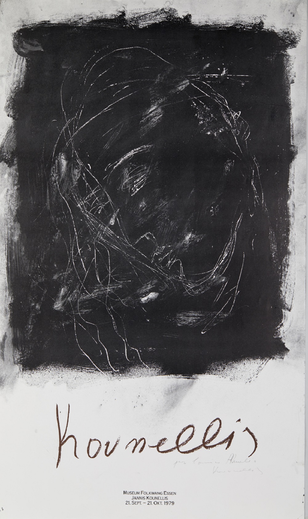 KOUNELLIS JANNIS (n. 1936) Senza titolo. 1979. Poster. Cm 50,00 x 85,00. Firma e dedica a matita in basso a destra. Poster illustrato con la riproduzione in bianco e nero di un'opera di Kounellis, edito in occasione della mostra tenutasi al Museum Folkwang di Essen dal 21 settembre al 21 ottobre 1979. Editore: Museum Folkwang, Essen. Bibliografia: Lailach 2005: pag. 135. Lievi difetti.