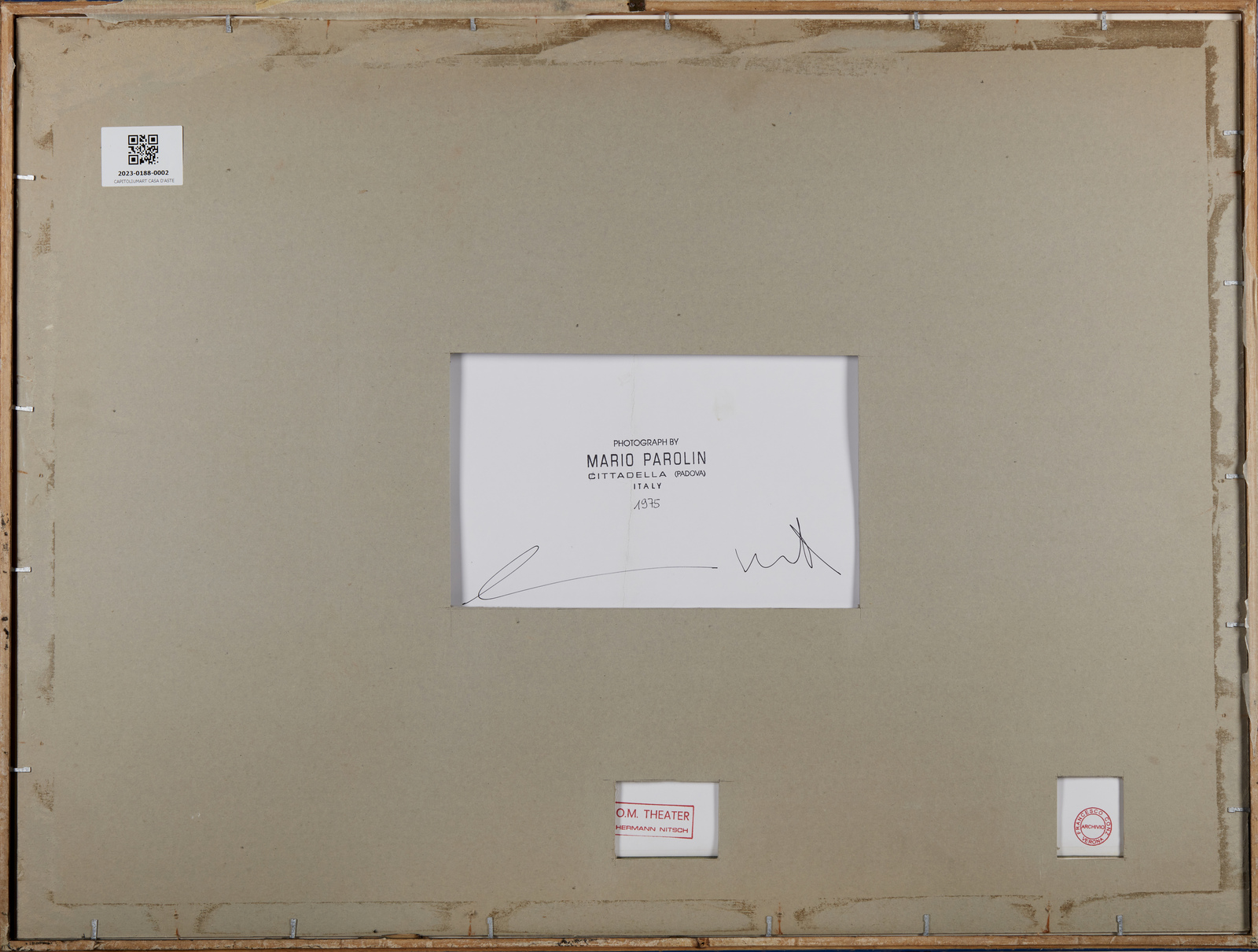 NITSCH HERMANN (1938 - 2022) Senza titolo. Fotografia b/n. Cm 64,50 x 50,00. Al retro firma e timbri O.M. Theater, Hermann Nitsch e Archivio Francesco Conz, Verona. Crediti fotografici Mario Parolin, Cittadella. Anno di scatto 1975. Lievi difetti. Cornice presente