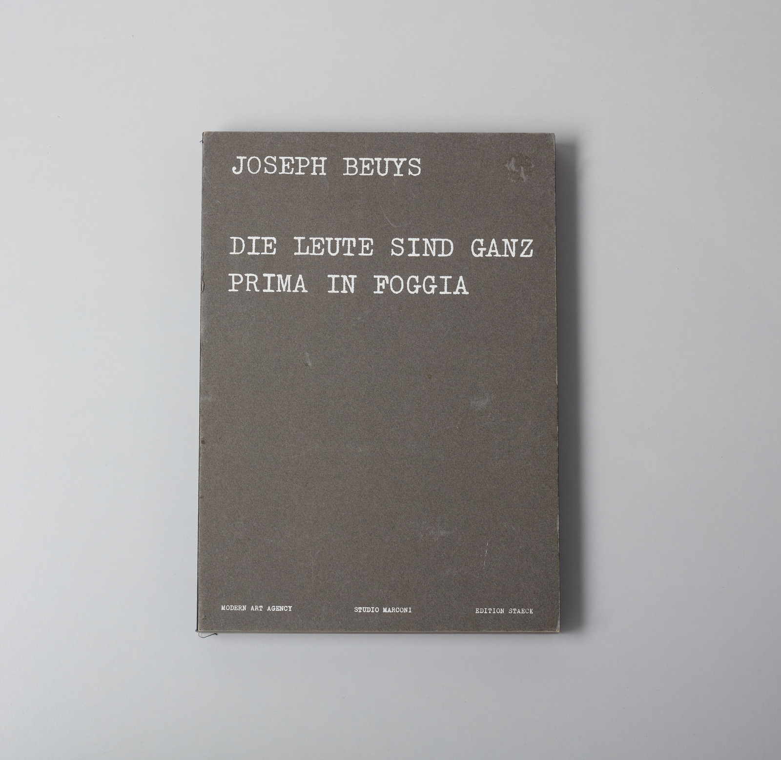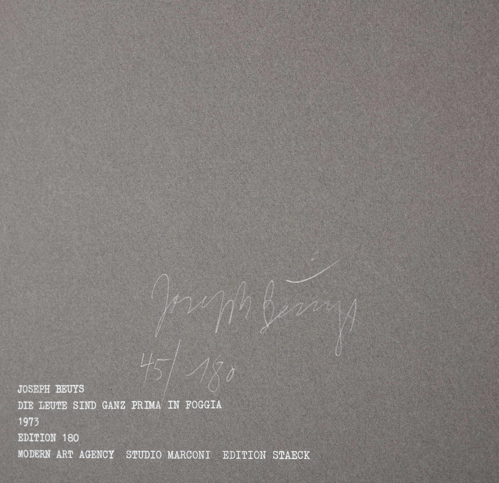 BEUYS JOSEPH (1921 - 1986) Die leute sind ganz. Prima in Foggia. 1973. Libro d'artista. Cm 22,00 x 31,50 x 2,50. 45/180. Firma e tiratura sul colophon a matita. Edizione totale: 180 + XL esemplari. Libro d’artista composto da 75 tavole serigrafate. Editore: Modern Art Agency, Napoli; Studio Marconi, Milano; Edition Staeck, Heidelberg. Lievi difetti.