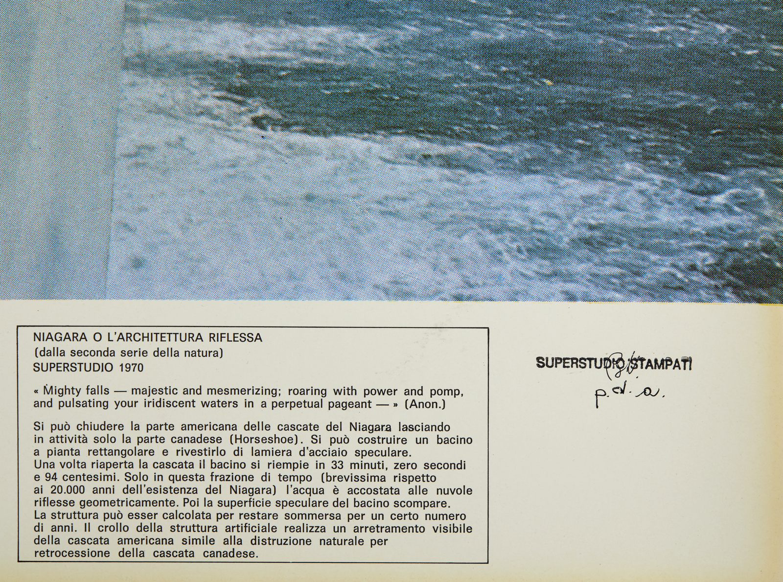 SUPERSTUDIO Niagara. 1970. Litografia offset su carta patinata. Cm 86,50 x 69,00. P.d.a. Tiratura e firma monogrammata di A. Natalini in basso a destra a penna. Titolo e anno stampati. Timbro a secco Plura Edizioni in basso a sinistra. Pubblicazione: P. Lang, W. Menking, Superstudio: lIfe Without Objects, Milano, Skira Editore, 2003, pp. 88-89. Il gruppo Superstudio, fondato a Firenze nel 1967 e composto da Adolfo Natalini, Cristiano Toraldo di Francia, Roberto Magris, Piero Frassinelli, Alessandro Magris, con Alessandro Poli dal 1970 al 1972, è stato attivo fino al 1978 e ha svolto attività di ricerca sperimentale. e teorico sul design. Foto esemplificativa.