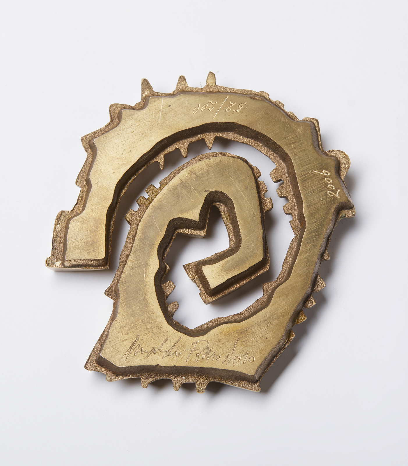 POMODORO ARNALDO (n. 1926) Fermacarte. 2006. Bronzo. Cm 9,50 x 11,50. 52/200. Tiratura, firma e anno incise al retro. Fusione a staffa, Boffino & Cereda, Abbiategrasso. Edizione totale: 200 esemplari numeri arabi + prove d'artista. Opera registrata nel Catalogue Raisonné di Arnaldo Pomodoro, sez. Multipli, #M249.