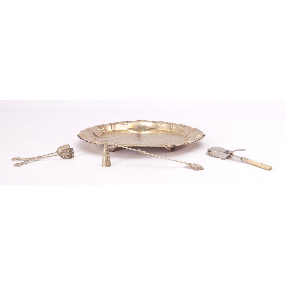 Una raccolta di 4 oggetti così suddivisa: un salver in Sheffield, una pinza per dolci in Sheffield, uno spegni moccolo in Sheffield, una paletta in Sheffield con manico in osso.