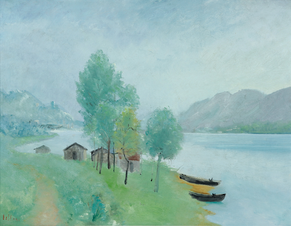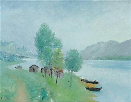 UMBERTO LILLONI Milano 01/03/1898 - Milano 15/06/1980 Lago ad Ariuno, 1940 olio su tela foderata cm. 50x64,5; firma in basso a sinistra, timbro dell'Archivio Fotografico Generale Umberto Lilloni ed etichette della Galleria d'Arte La Borgognona (Roma) e della Galleria Annunciata (MI) al retro, timbro e firma per autenticità e provenienza della Galleria Annunciata (MI) su foto, opera registrata presso l'Archivio Fotografico Generale Umberto Lilloni come da dichiarazione su due foto.