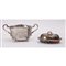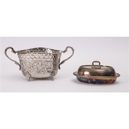 Centrotavola in metallo argentato a forma di coppa con due anse e decori a ramage, una legumiera in Sheffield di forma ovale.