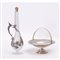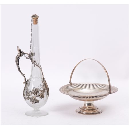 Una grande ed importante bottiglia in cristallo e argento decorata con tralci di vite e uva, sul manico una figura femminile, tappo in sughero; un’alzata con manico in old Sheffield con coppa baccellata.