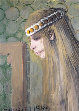 SERGIO VACCHI Castenaso (Bo) 01/04/1925 La fanciulla delle margherite, 1989 olio su tela cm. 70x50, firma e anno in basso, titolo, firma e anno al retro.