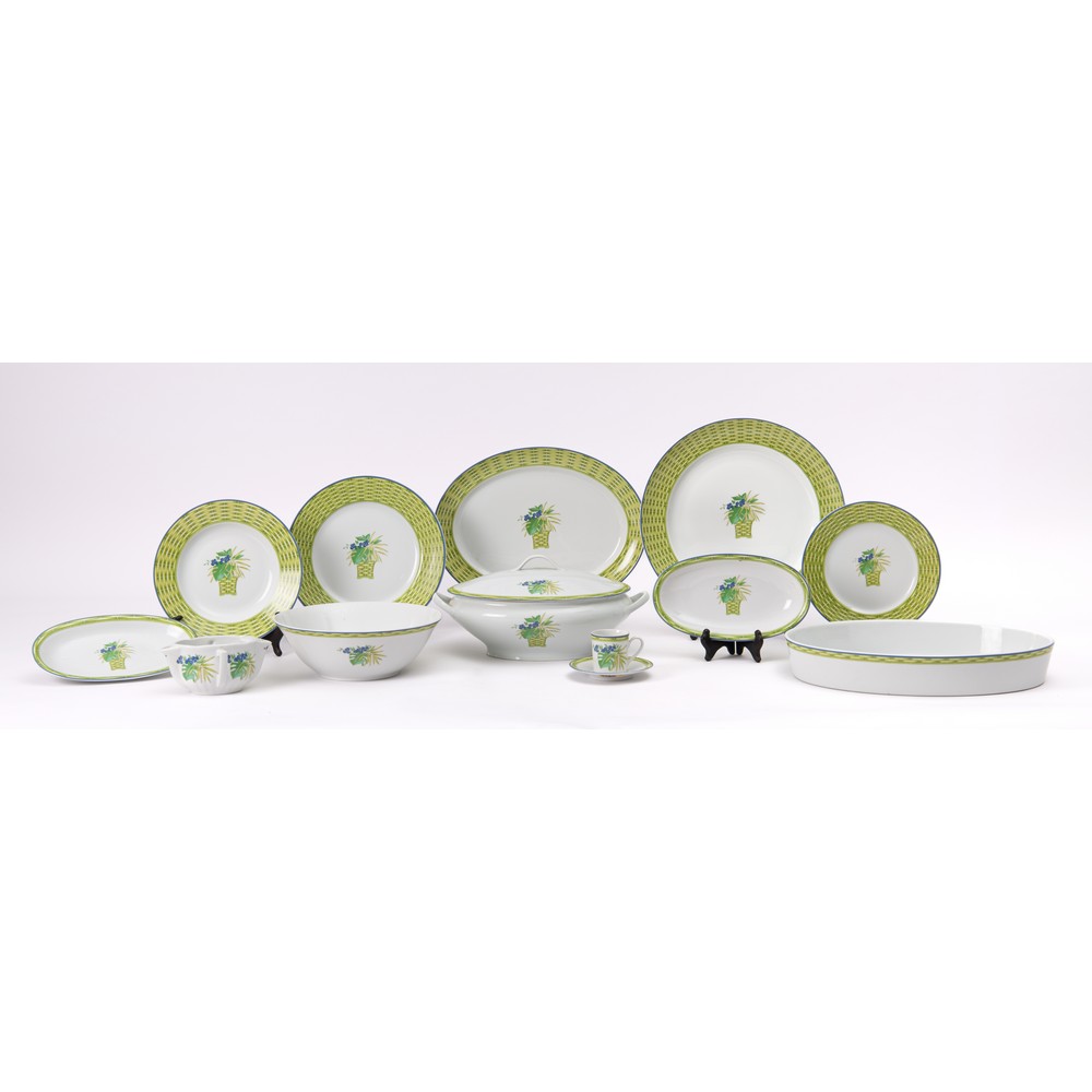 Servizio piatti in porcellana bianca modello “Patio” con bordo a canestro verde e blu decoro centrale con cesto di fiori e foglie nei toni verde e blu, composto da 67 pezzi così suddivisi: 24 piatti piani, 12 piatti fondi, 12 piatti frutta, una zuppiera, un’insalatiera, un piatto da portata ovale, una pirofila ovale, 2 raviere, una salsiera, 12 tazze caffè con piattino.