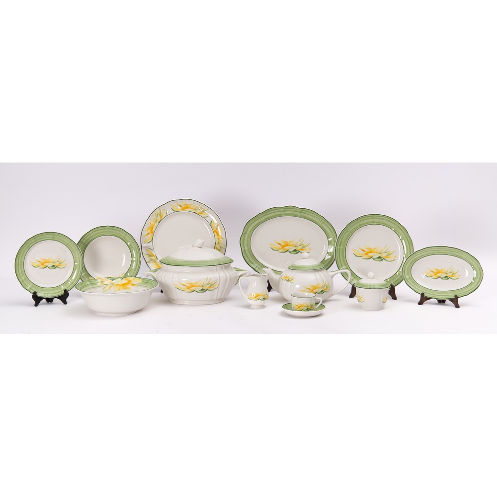 Servizio piatti in porcellana bianca con bordo mosso verde e decoro centrale floreale giallo, composto da 56 pezzi così suddivisi: 12 piatti piani, 12 piatti fondi, 12 piatti frutta, una zuppiera, un’insalatiera, un piatto da portata ovale, un piatto da portata circolare, una raviera, 12 tazze caffè con piattino, una caffettiera, una lattiera, una zuccheriera.