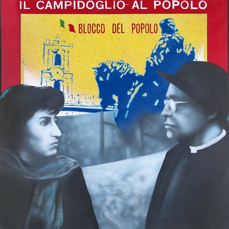 GIANGIACOMO SPADARI San Marino 04/04/1938 - Milano 21/04/1997 Roma città aperta 1947, 1974 olio e vernice spray su tela cm. 100x100, firma, titolo e anno al retro, dichiarazione d'autenticità e archivio della Galleria Arte Borgogna (MI) su foto.