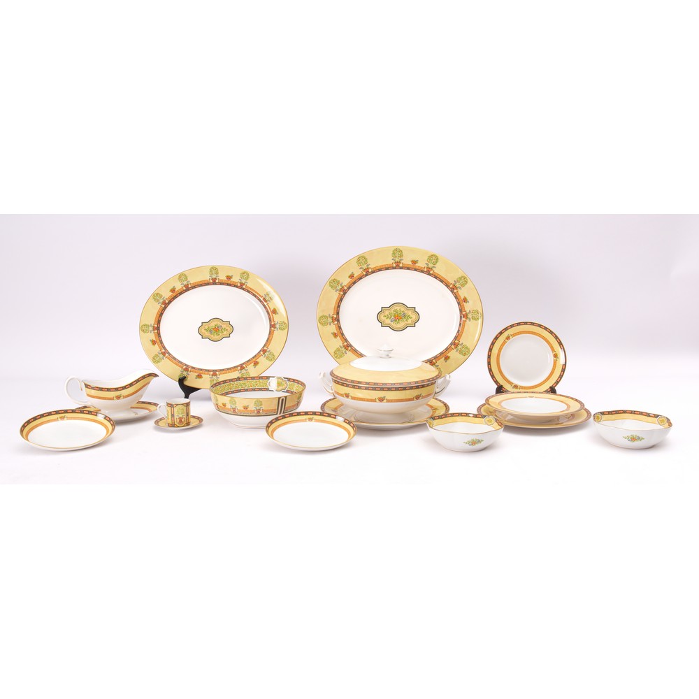 Servizio piatti modello “Versailles” in porcellana bianca decorata con motivi botanici verdi, gialli e arancio, da 68 pezzi così suddiviso: 24 piatti piani, 12 piatti fondi, 12 piatti frutta, una zuppiera, una insalatiera, 2 raviere, un piatto da portata circolare, due piatti da portata ovale, 12 tazze caffé con piattino.