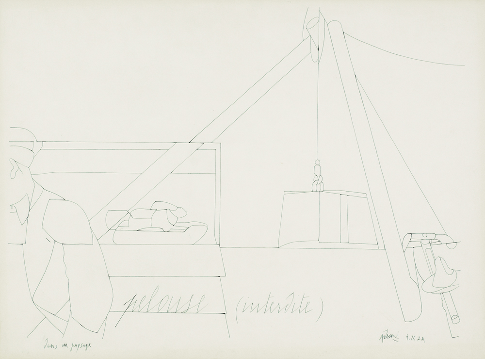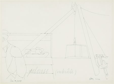 VALERIO ADAMI Bologna 17/03/1935 Dans un paysage, 1974 disegno a matita su carta cm. 57x77, firma e anno in basso a destra, titolo in basso a sinistra, certificato di provenienza della Galleria Allegrini Arte Contemporanea (BS) allegato.