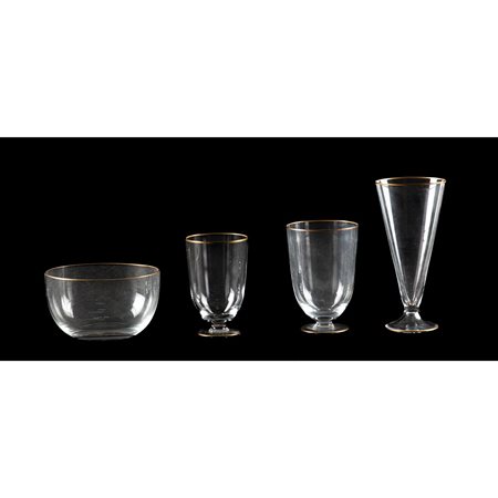 Servizio di bicchieri in vetro soffiato e decorato nei bordi con filo oro, composto da 48 pezzi così suddiviso: 12 bicchieri acqua,12 bicchieri vino,12 flûte champagne,12 coppe da macedonia.