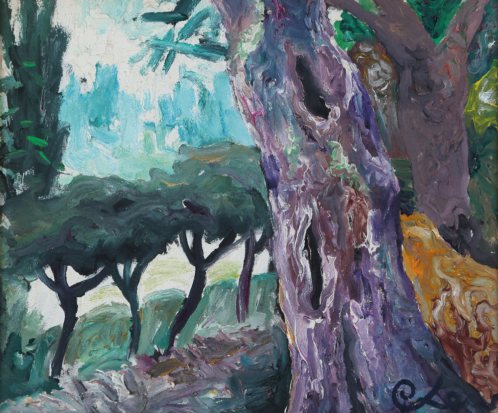 CARLO LEVI Torino 29/11/1902 - Roma 04/01/1975 Bosco, 1974 olio su tela cm. 50x60, firma in basso a destra, firma e numero 74073B 33A dell'artista al retro, opera registrata presso l'Archivio Opere di Carlo Levi come da dichiarazione su foto con timbro della Galleria Centro Dell'Arte (Roma).