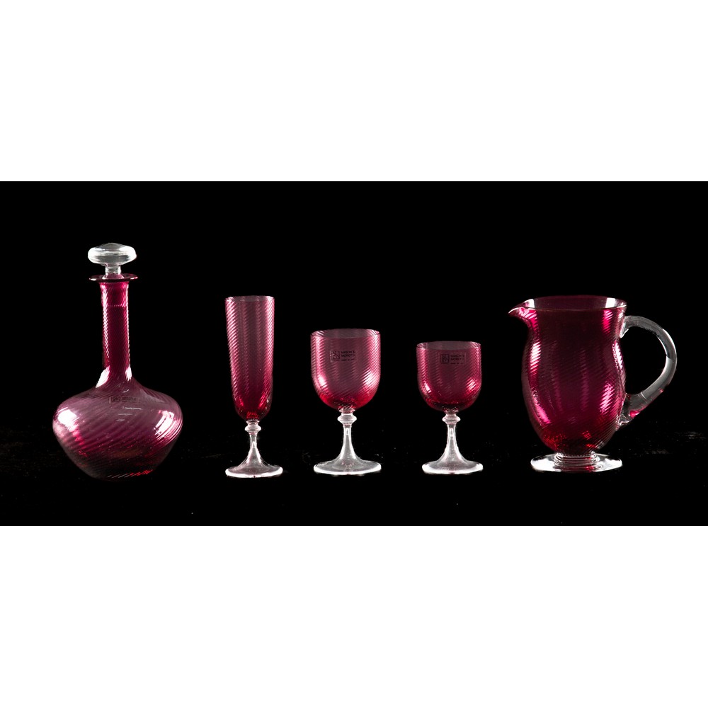 Servizio di bicchieri 38 pezzi in vetro soffiato a torchon “Rubino” così suddiviso: 12 bicchieri acqua, 12 bicchieri vino, 12 flûte champagne, una caraffa, una bottiglia.