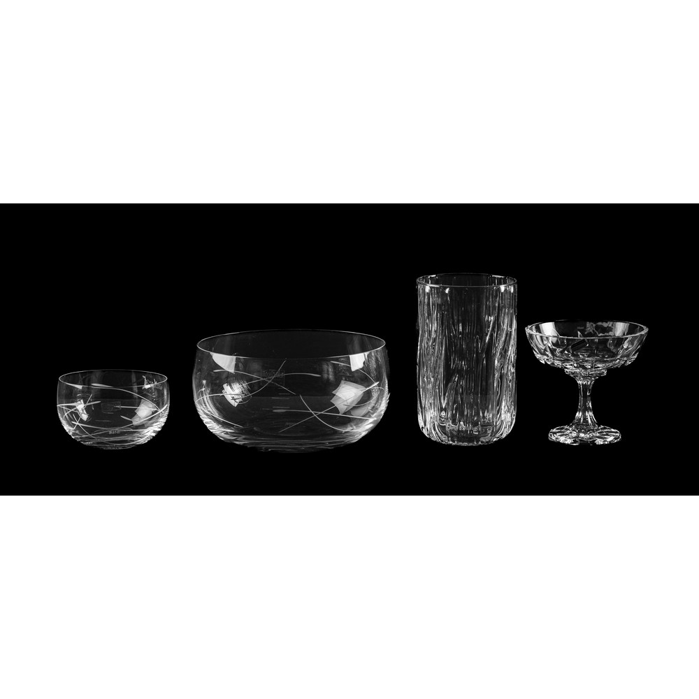 Servizio da macedonia modello “Gentiane” in cristallo trasparente con decori incisi composto da 13 pezzi così suddiviso: 12 coppe macedonia ,1 coppa grande. Una alzata Villeroy & Boch in cristallo trasparente. Un vaso in vetro a corpo cilindrico con decori verticali astratti.