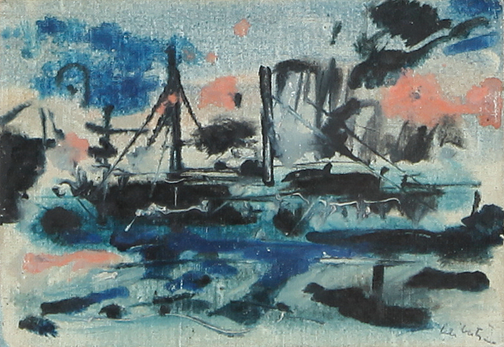GIORGIO CELIBERTI Udine 19/11/1929 Marina, 1962 olio su cartone telato cm. 14x20,5; firma in basso a destra, dichiarazione d'autenticità dell'artista su foto.