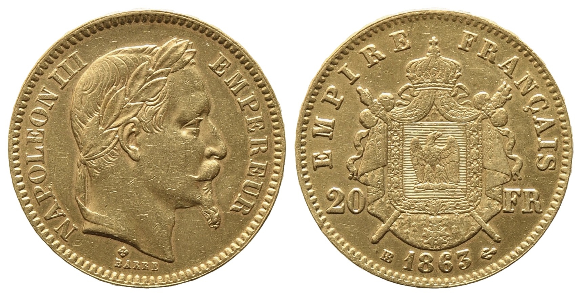 FRANCIA. Napoleone III (1852-1870). 20 franchi 1863. Strasburgo. Au (6,45 g). qSPL