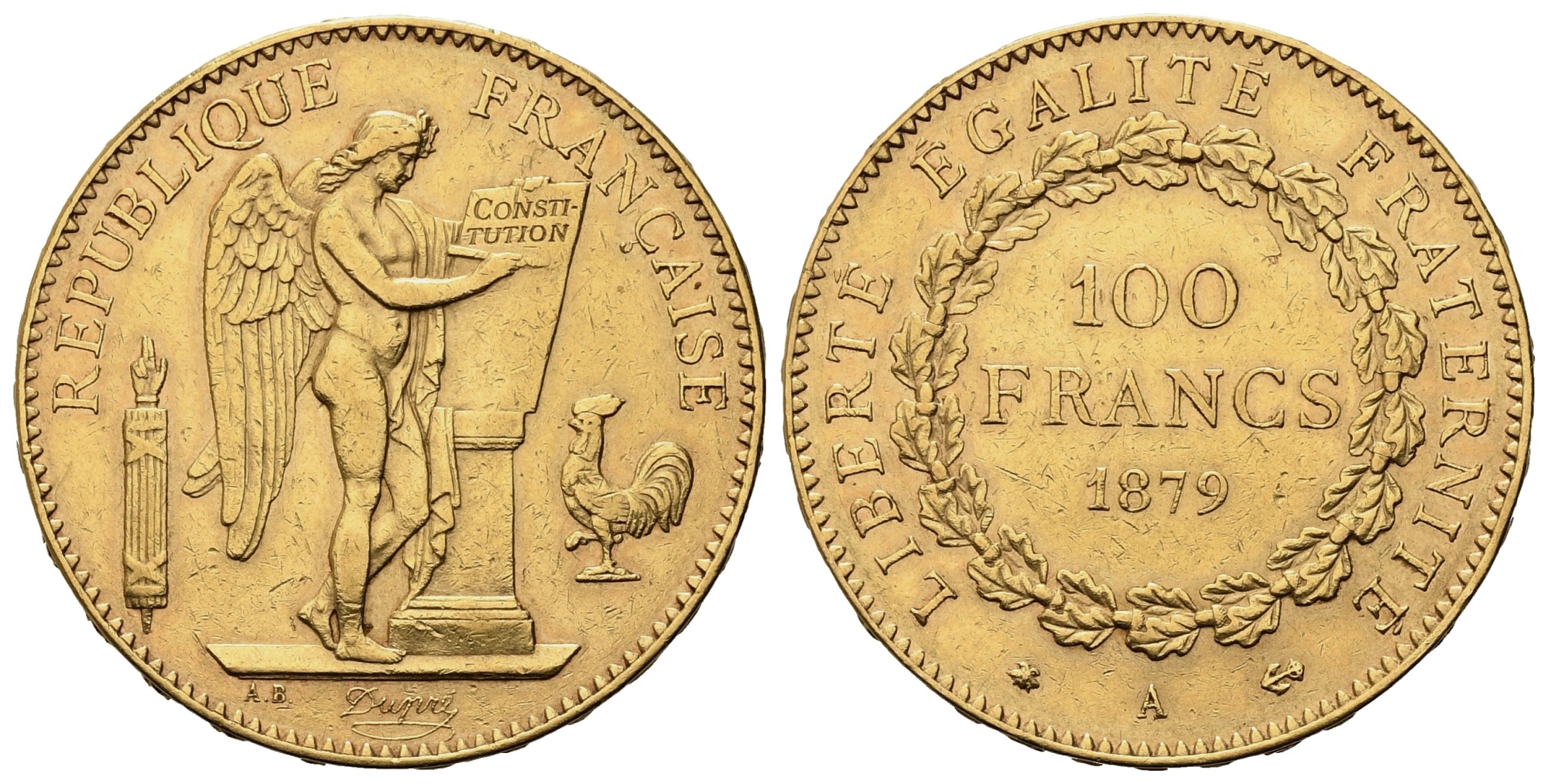 FRANCIA. Terza Repubblica (1870-1940). 100 franchi 1879. Parigi. Au (34,85 mm – 32,30 g). KM#832. BB/qSPL