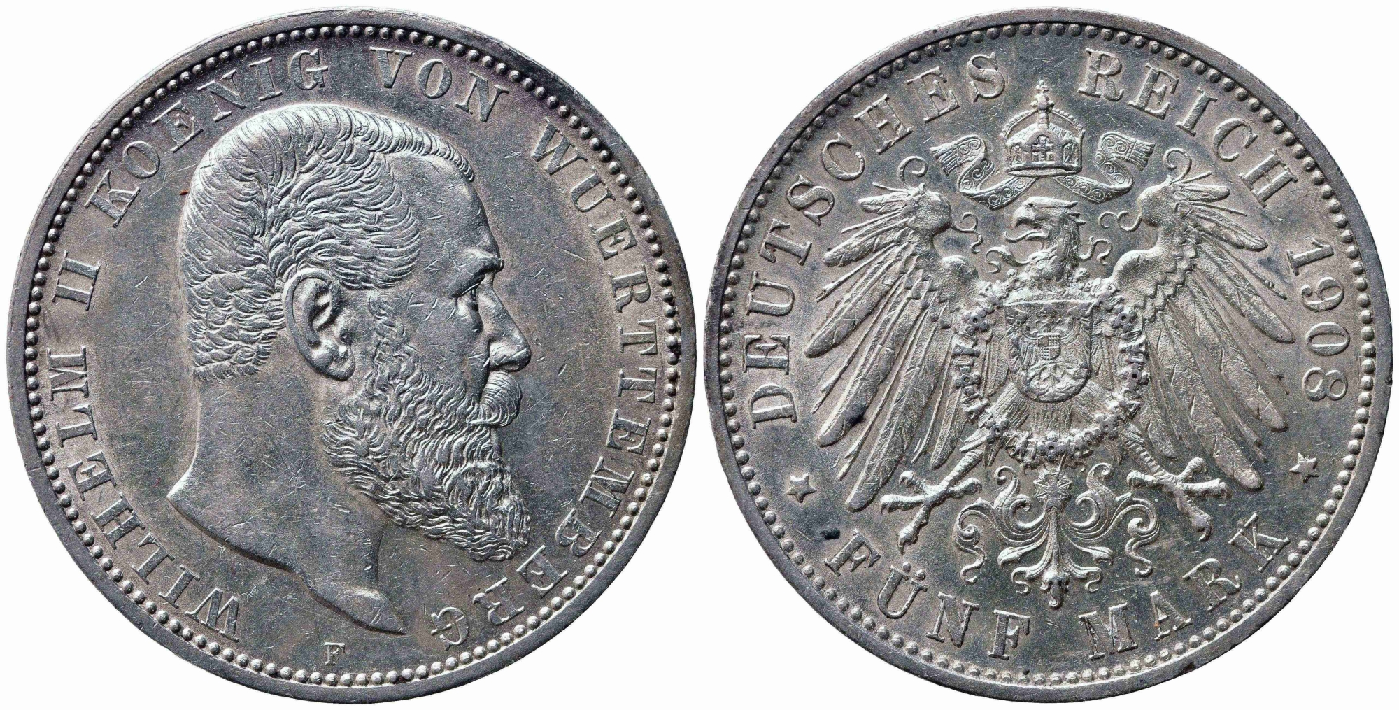 GERMANIA. Wurttemberg. 5 Mark 1908. Ag. KM#632. Fondi lucenti. SPL