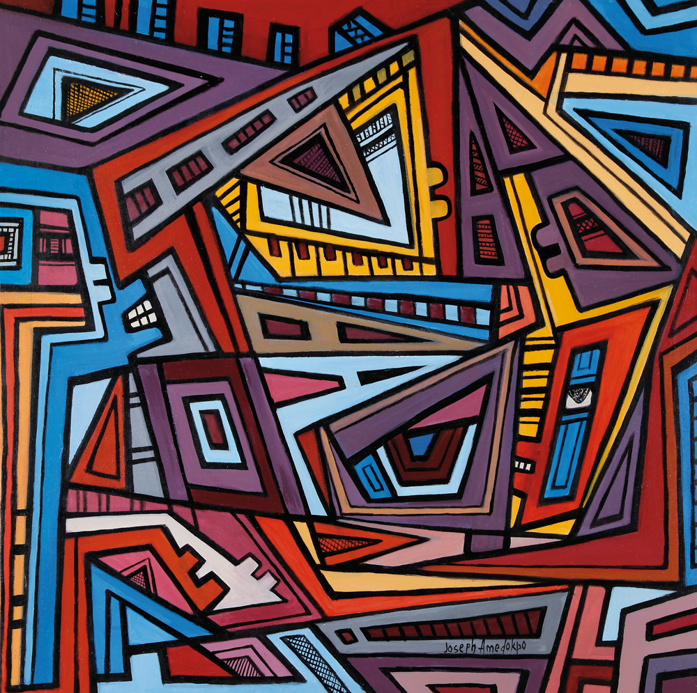 JOSEPH AMEDOKPO Vogan (Togo) 1946  Engungun Masquerades olio su tela di sacco cm. 80x80, firma in basso a destra, titolo al retro, certificato della Galleria Luca Sforzini Arte allegato.