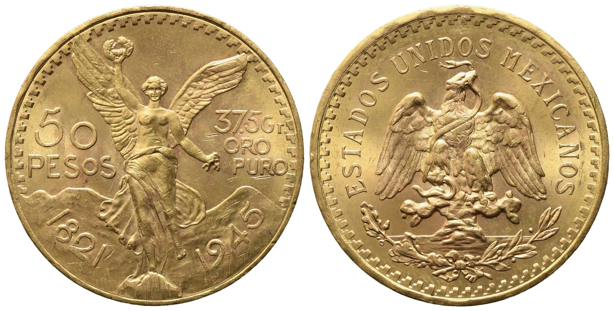 MESSICO. 50 pesos 1945. Au titolo 900 (41,66 g, di cui 37,50 g di oro puro)....