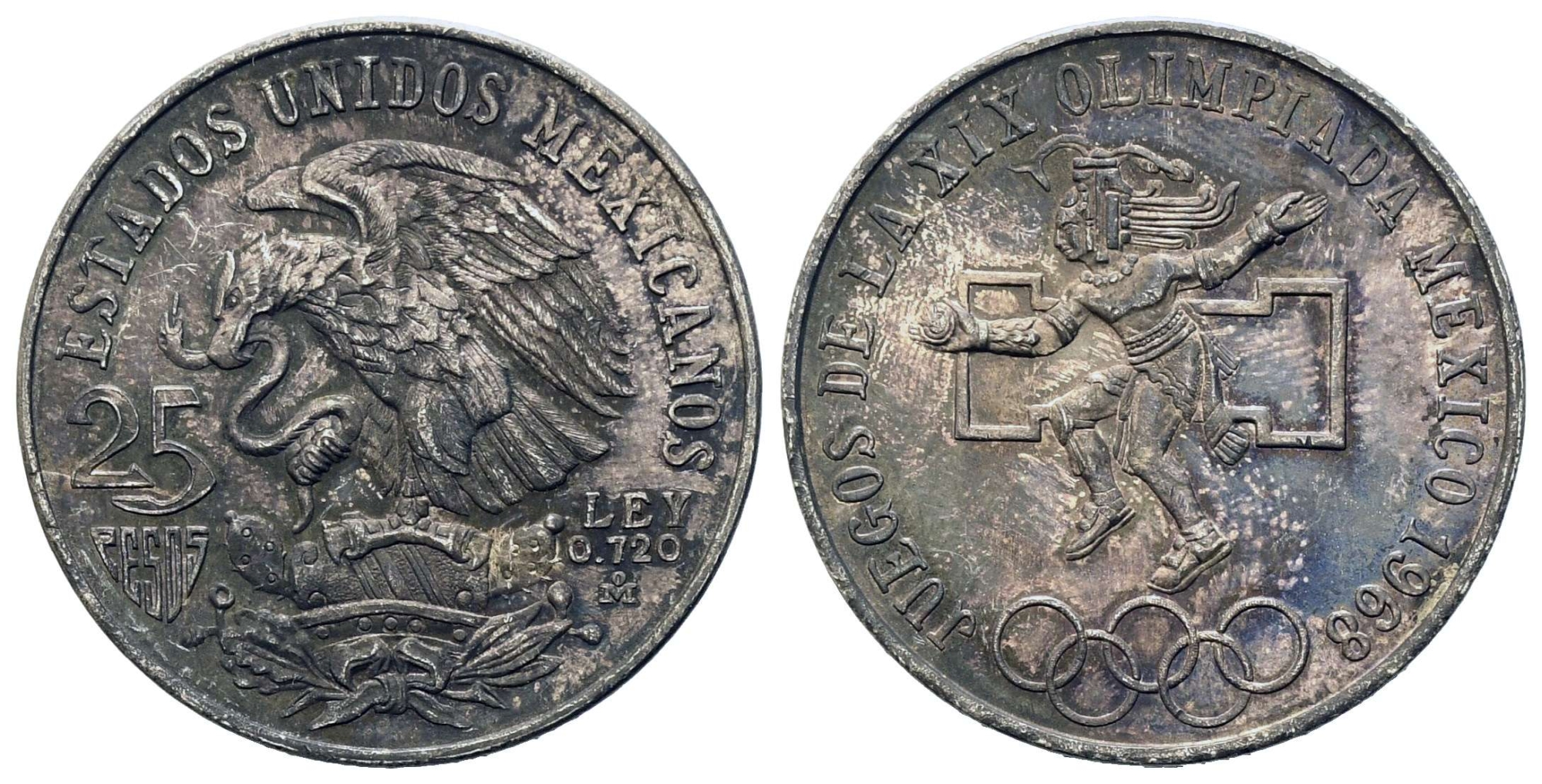 MESSICO. 25 Pesos 1968. Commemorativa Olimpiadi. Ag 720 (22,4 g). SPL/FDC. Intensa patina scura.