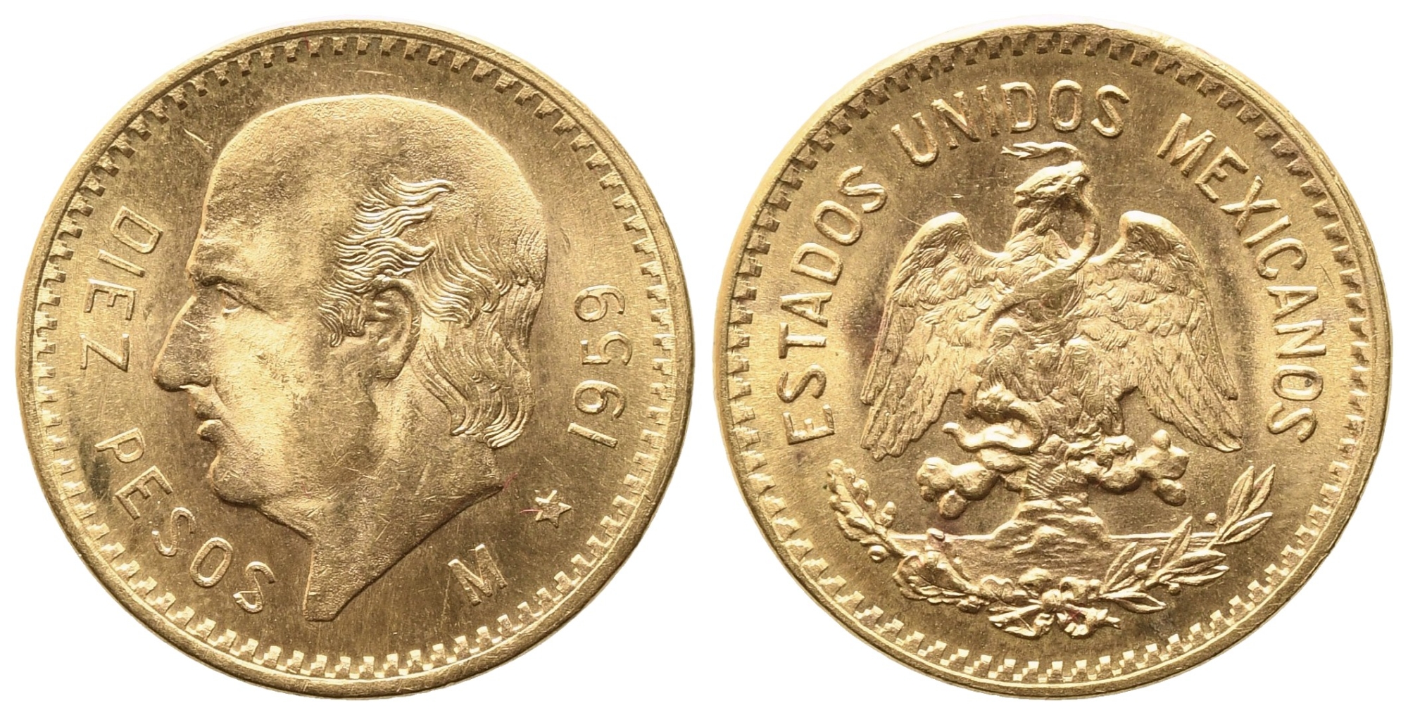 MESSICO. 10 pesos 1959. Au titolo 900 (8,30 g). qFDC