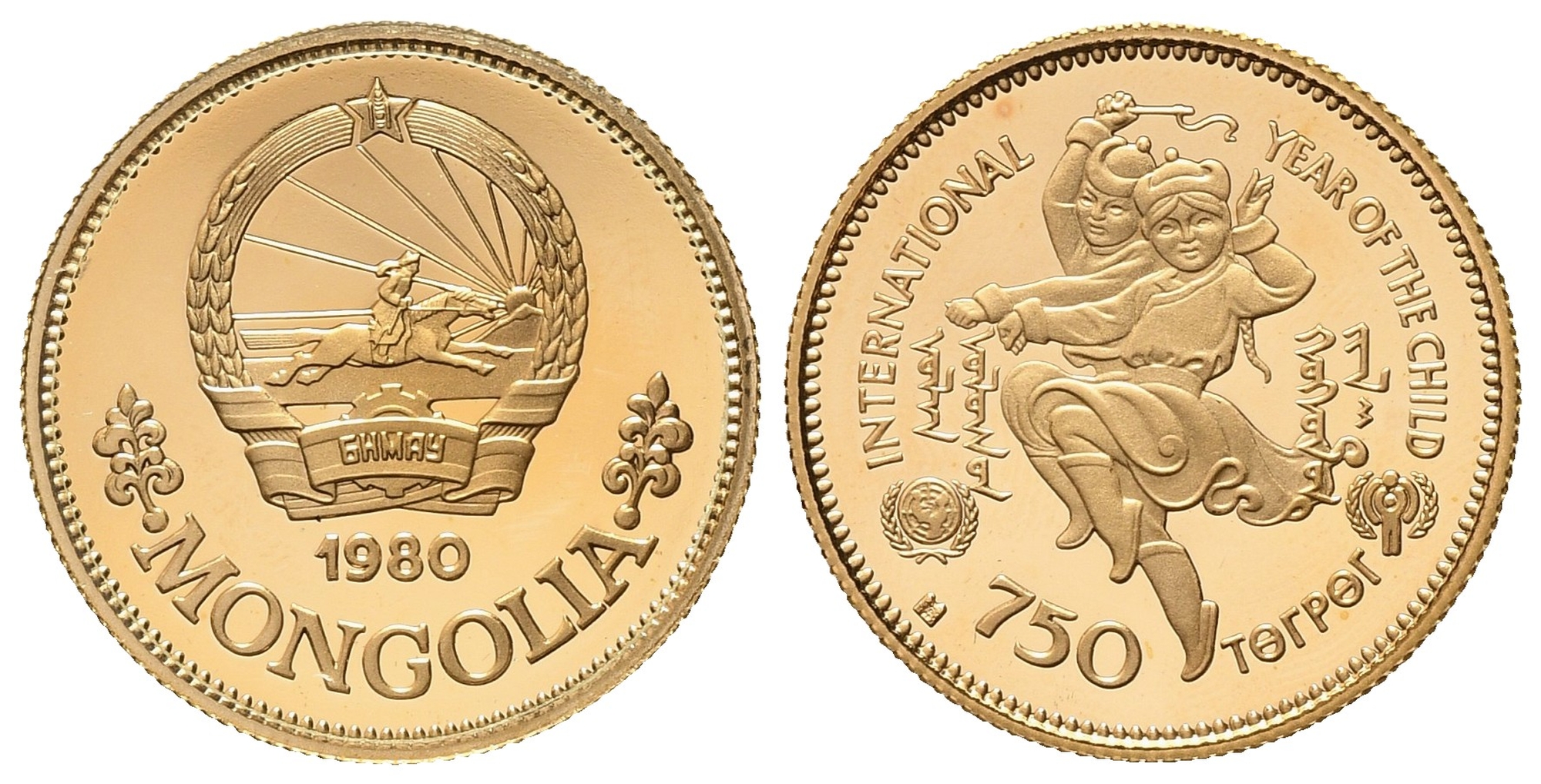 MONGOLIA. 750 tugrik 1980. Anno internazionale del bambino. Au titolo 900 (18,79 g, di cui 16,91 di oro puro). PROOF