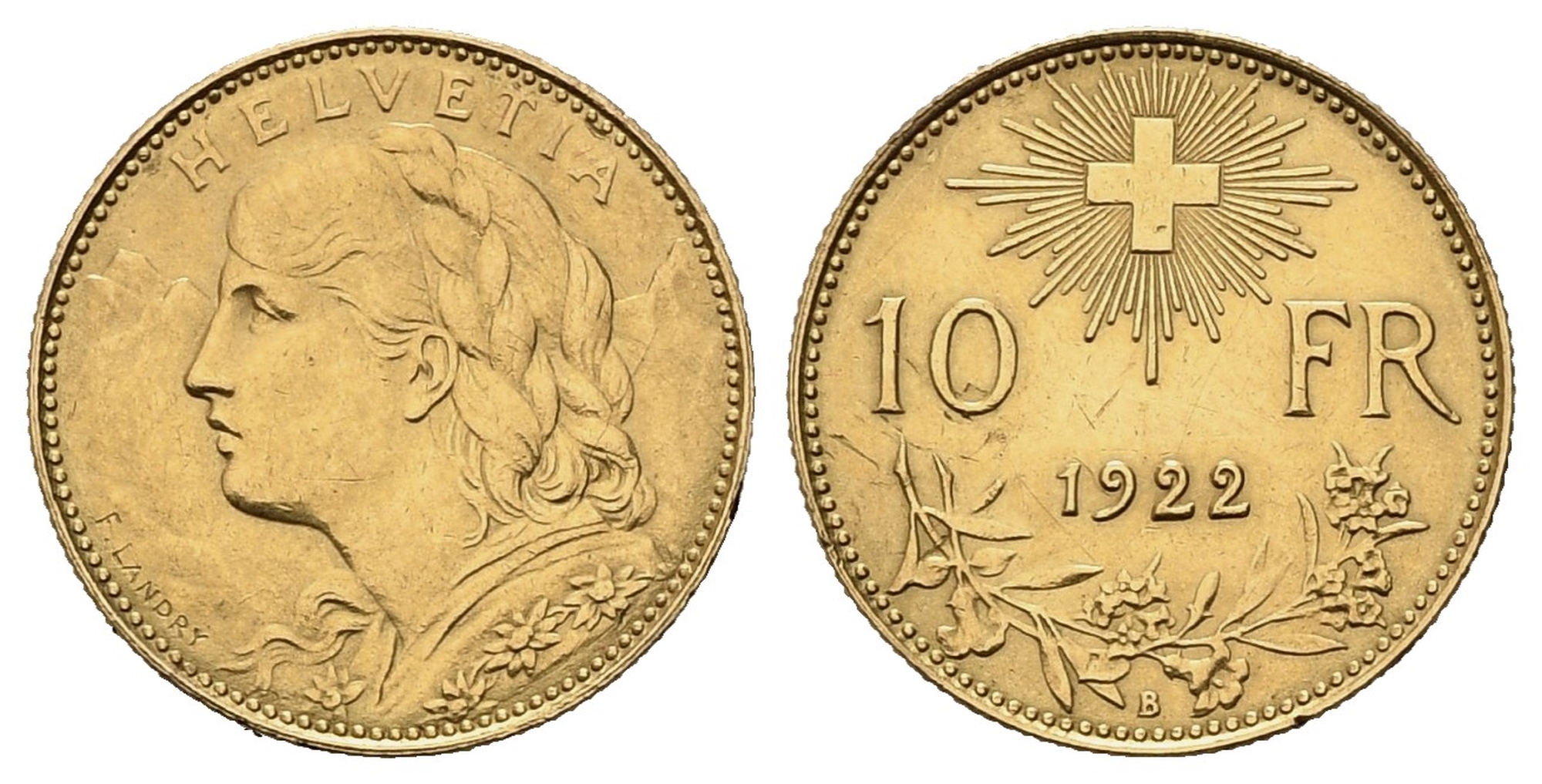 SVIZZERA. 10 franchi 1922. B. Au (18,95 mm – 3,22 g). SPL