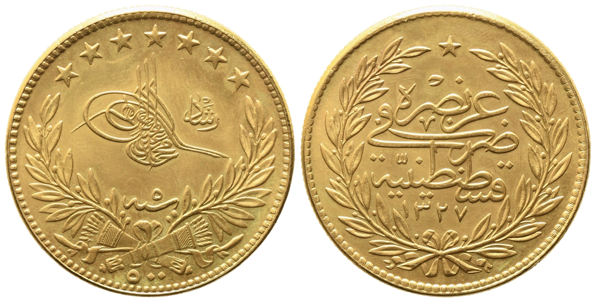 TURCHIA. Impero ottomano. Mehmed V Resed (1909-1918). 500 kurush 1910 (1327). Au titolo 917 (35, 42 g). R. qFDC