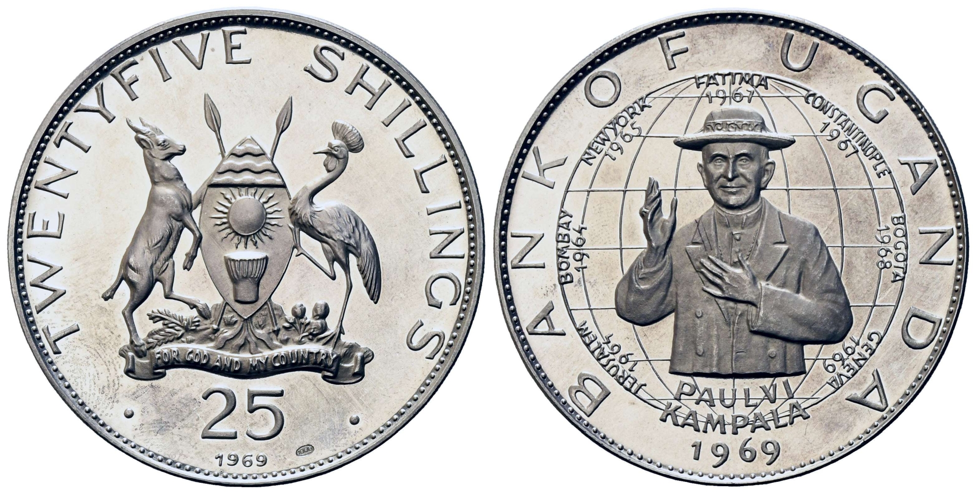 UGANDA. 25 Shillings 1969. Ag. Visita di papa Paolo VI. Stemma nazionale R/ Mezzo busto frontale del papa su globo. KM#12 (tiratura 6.070 pezzi). QFDC