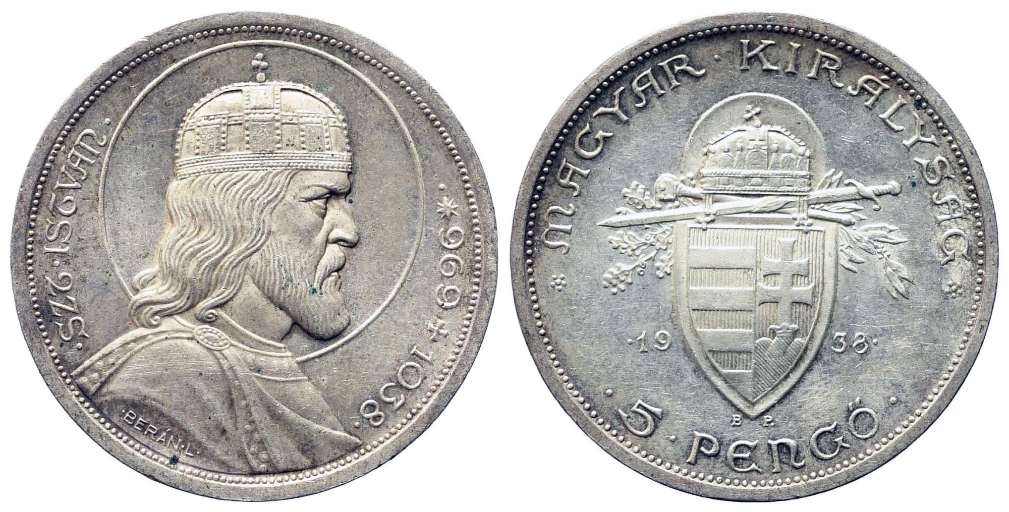 UNGHERIA. 5 pengo 1938. Commemorativa per i 900 anni dalla morte di Stefano...