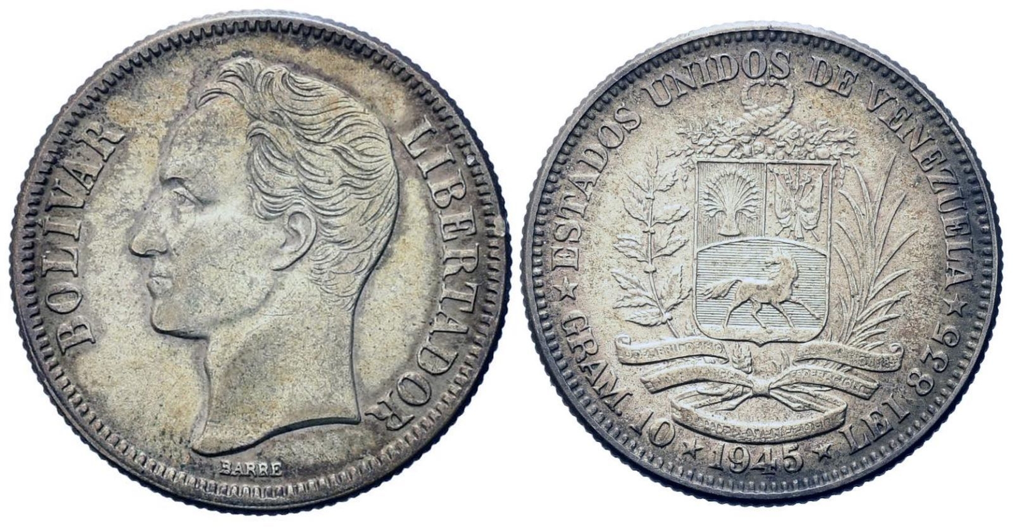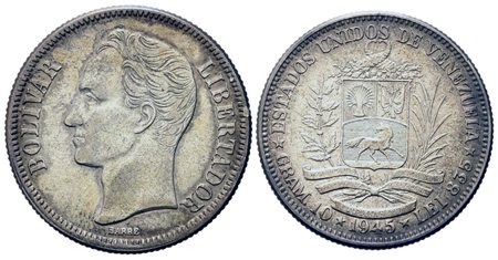 VENEZUELA. 2 bolivares 1945. Ag (26,95 mm – 9,96 g). SPL