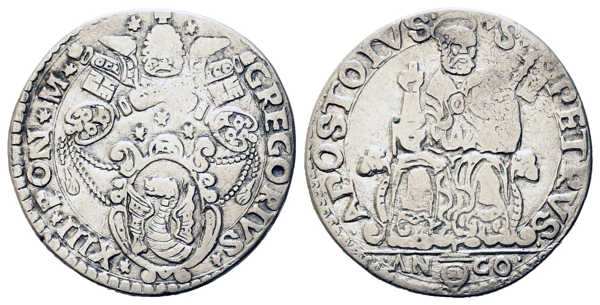 ANCONA. Stato Pontificio. Gregorio XIII (1572-1585) Testone. Ag (8,53 g). GREGORIVS - XIII PON M. Stemma ovale sormontato da triregno e chiavi decussate. R/ S - PETRVS - APOSTOLVS. S. Pietro in trono; in esergo, AN simbolo (segno dello zecchiere Stefano Benincasa) CO. Munt. 230; Berm. 1218. R. BB