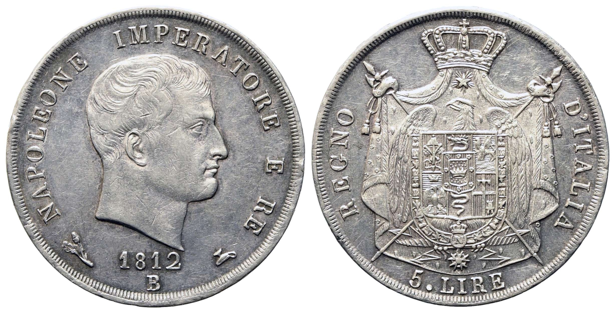 BOLOGNA. Regno d'Italia. Napoleone I, re (1805-1814). 5 lire 1812. Ag (38 mm – 25 g). Puntali aguzzi. Gig. 112. qSPL/SPL. Fondi lucenti.