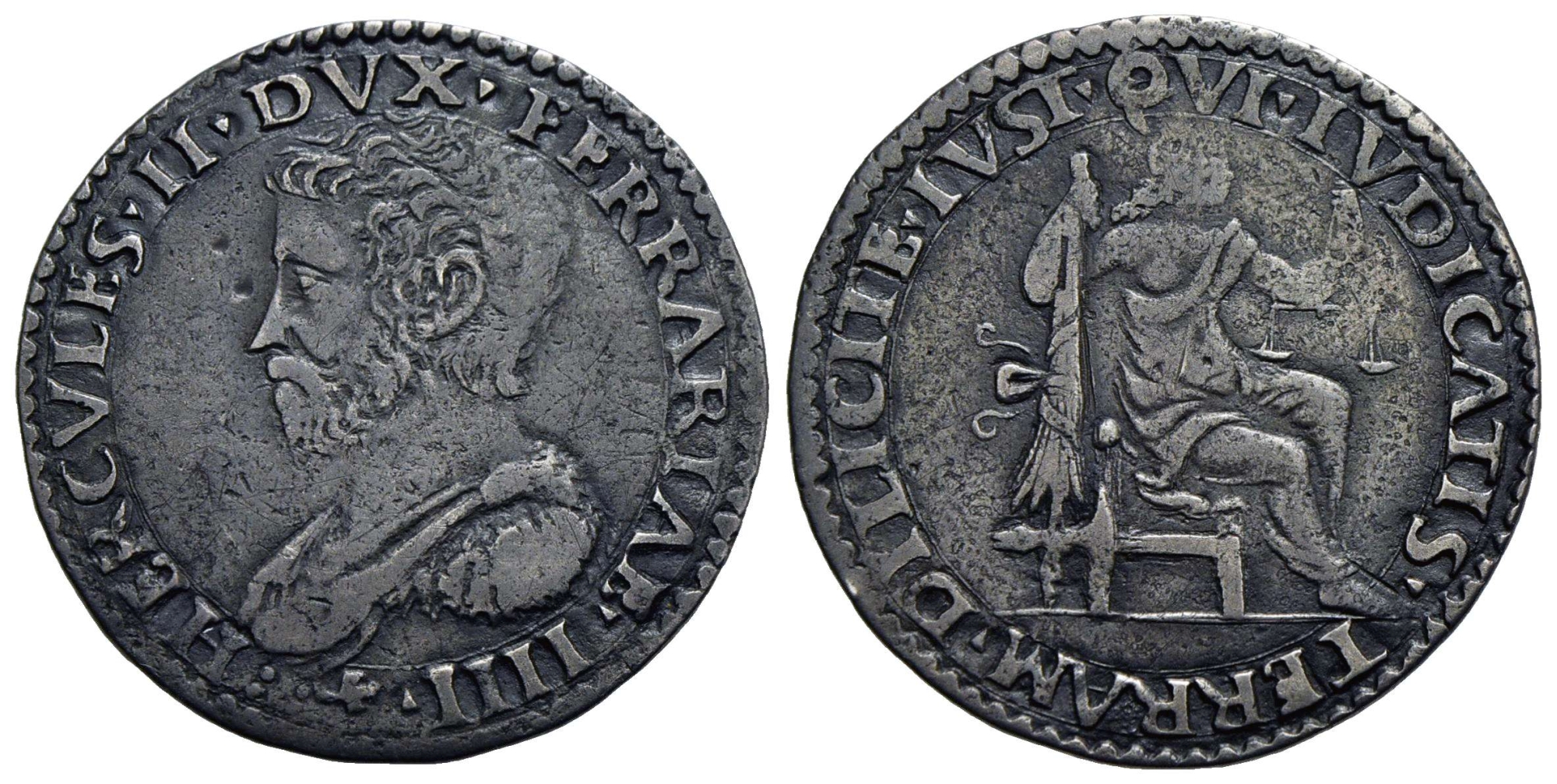 FERRARA. Ercole II d'Este (1534-1559). Bianco. Ag (4,80 g). Busto a s. - R/ La giustizia seduta. RR CNI 53/60; MIR 296 Bella patina di antica collezione. Ex Asta NAC 60 L. 26. BB+