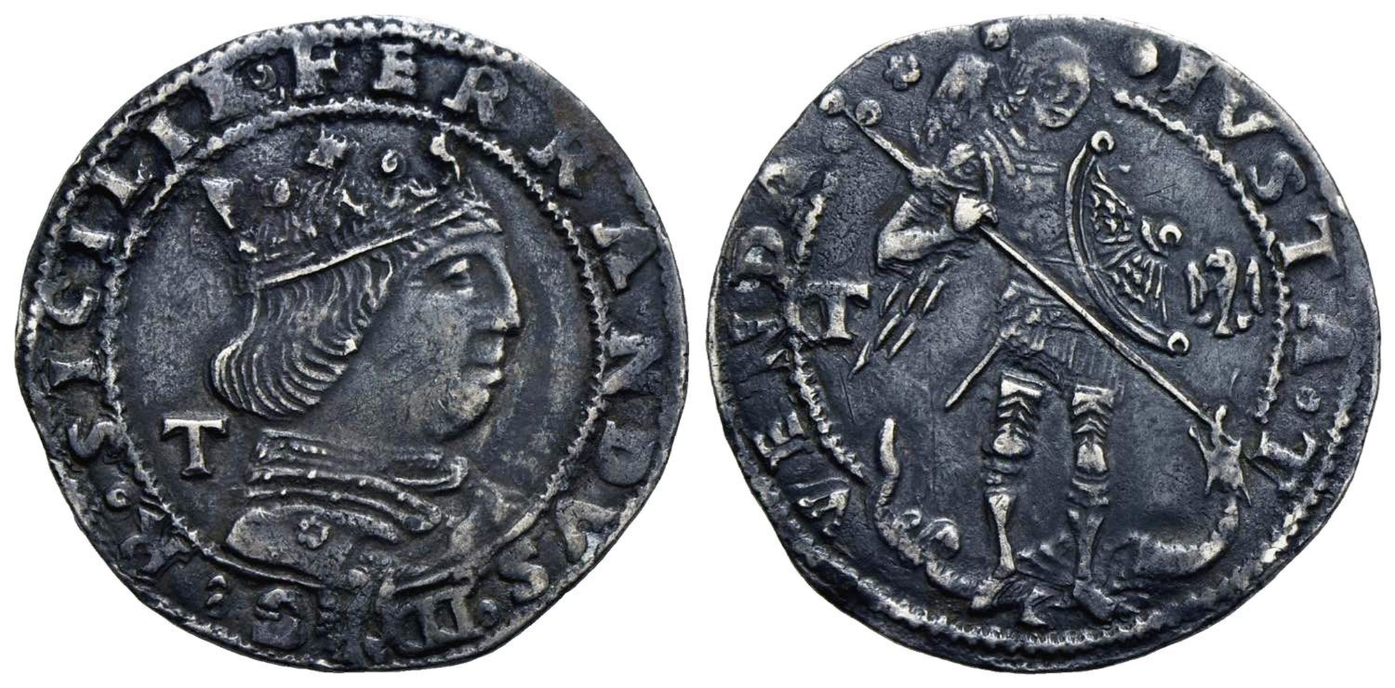 L’AQUILA. Regno di Napoli. Ferdinando I d’Aragona (1458-1494). Coronato. Busto coronato a d.; dietro T - R/ L'Arcangelo Michele uccide il drago. Ag (3,84 g). Bellissima patina scura di antica collezione, modulo ampio. Ex Asta Nomisma 39 Lotto 2037. R. BB+