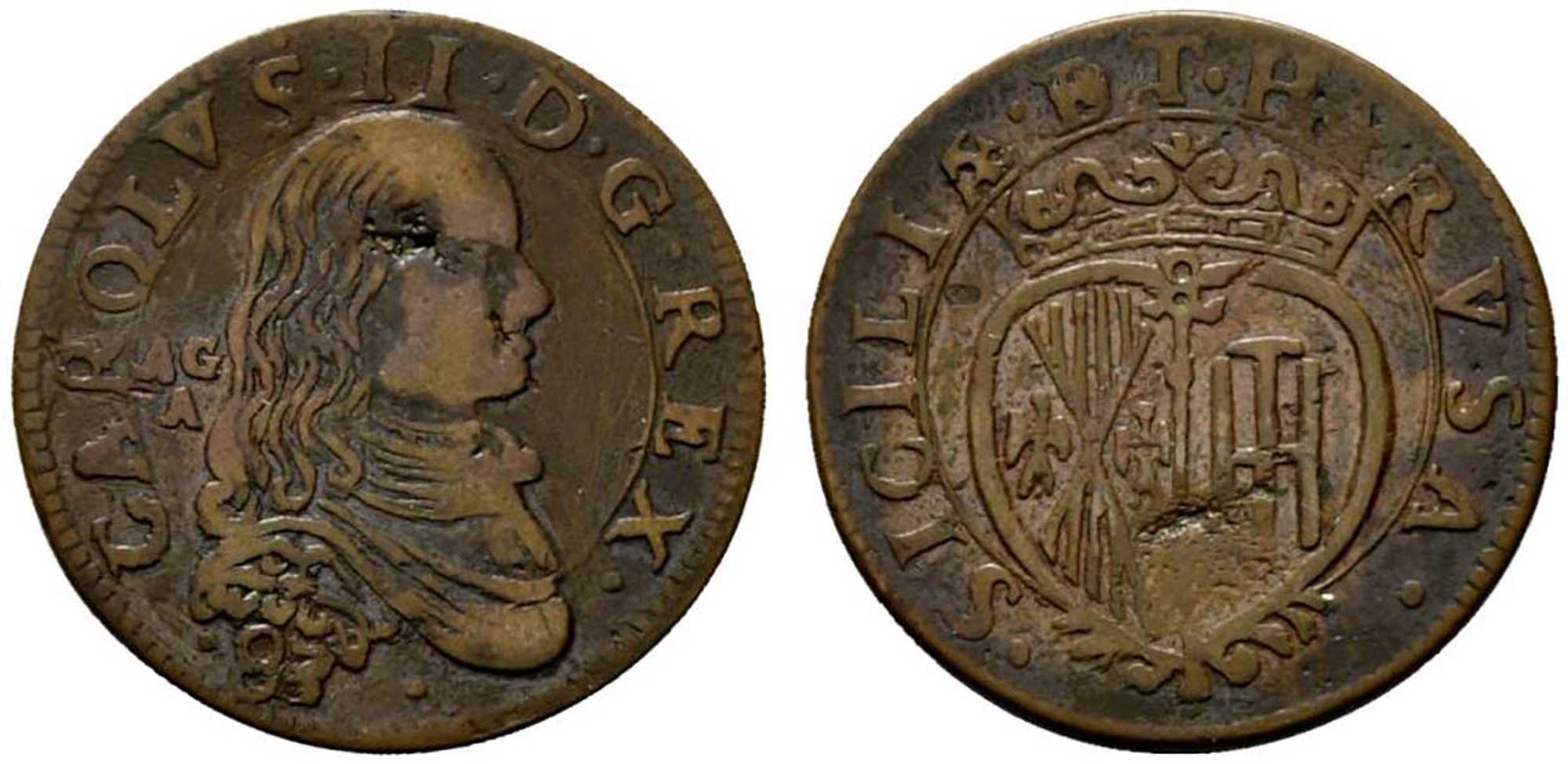 NAPOLI. Regno di Napoli. Carlo II di Spagna (1665-1700). Grano 1683 coniato al bilanciere. Cu (8,02 g). Busto a ds.; dietro la nuca, sigla AG/A R/ Stemma coronato. Pann. 59. BB+