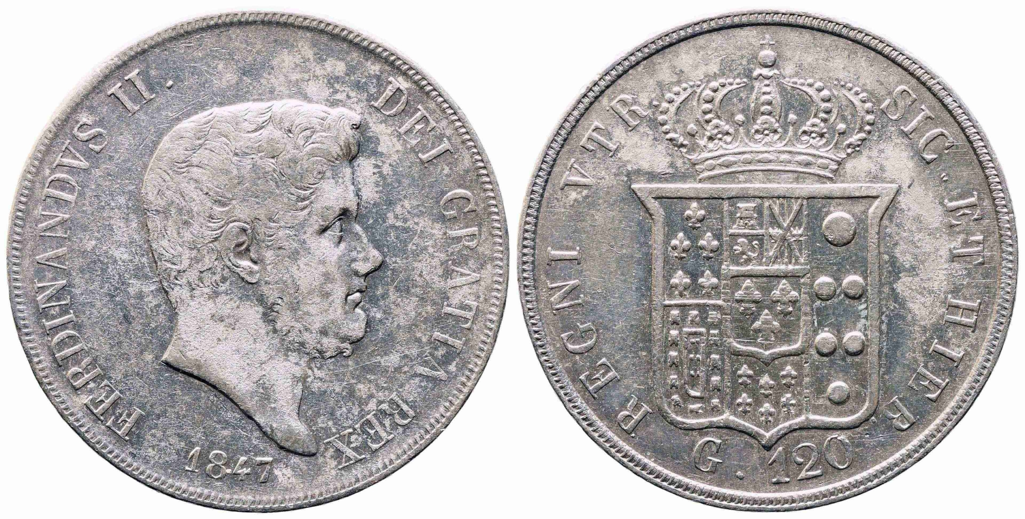 NAPOLI. Regno delle Due Sicilie. Ferdinando II di Borbone (1830-1859). Piastra da 120 grana 1847. Ag. BB/qSPL