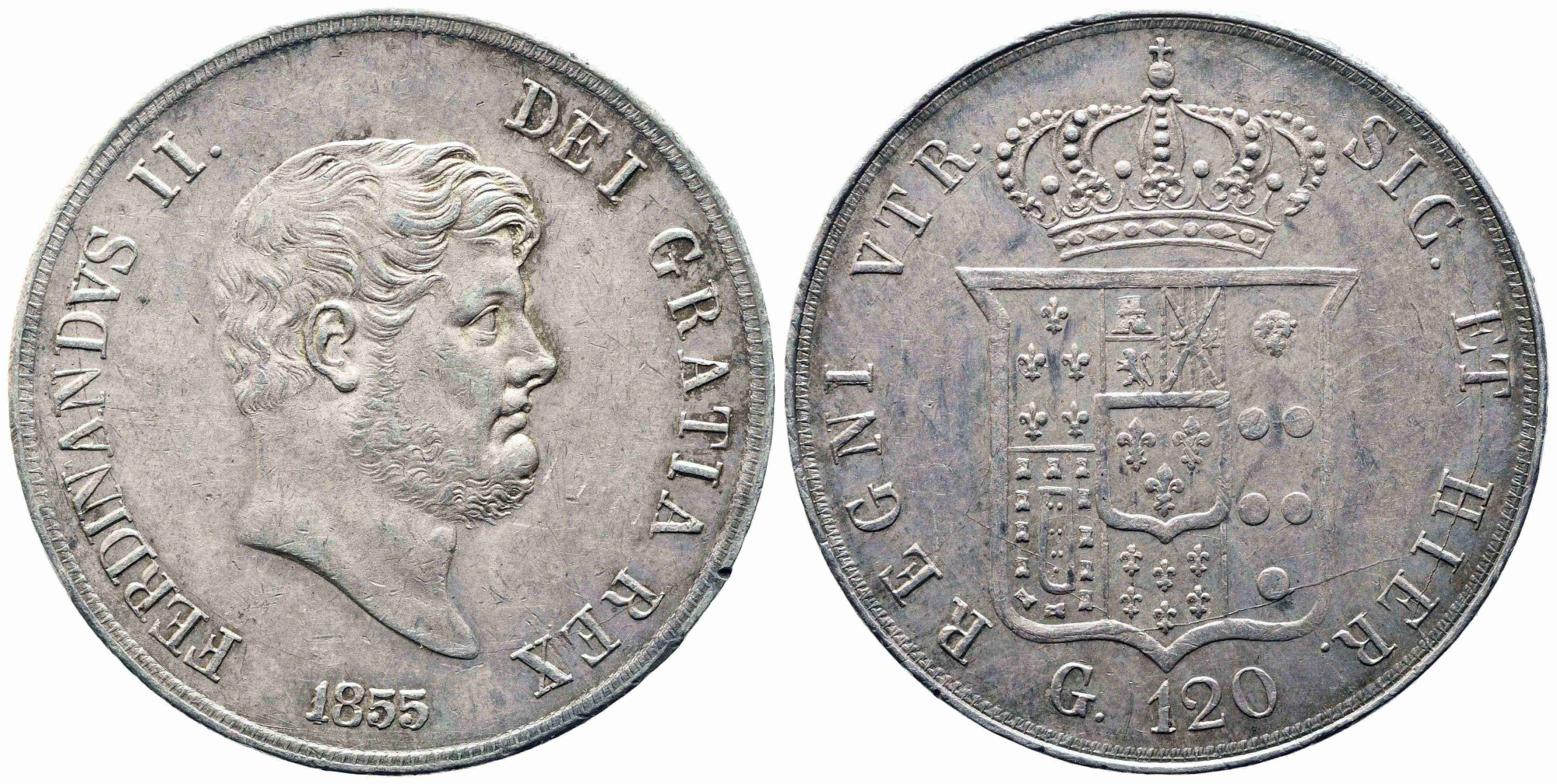 NAPOLI. Regno delle Due Sicilie. Ferdinando II di Borbone (1830-1859). Piastra da 120 grana 1855. Ag. SPL. Bella patina di antica collezione