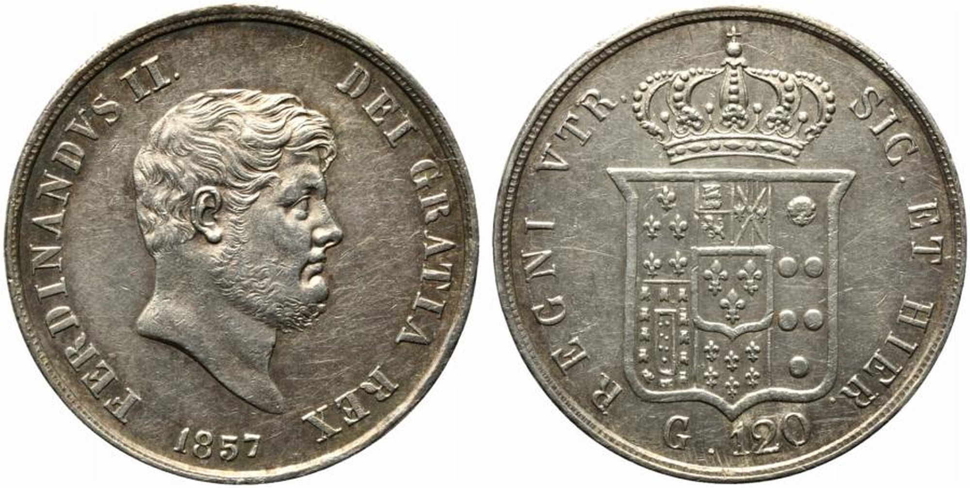 NAPOLI. Regno delle Due Sicilie. Ferdinando II di Borbone (1830-1859). Piastra da 120 grana 1857. Ag (27,45 g). Gig. 88. SPL