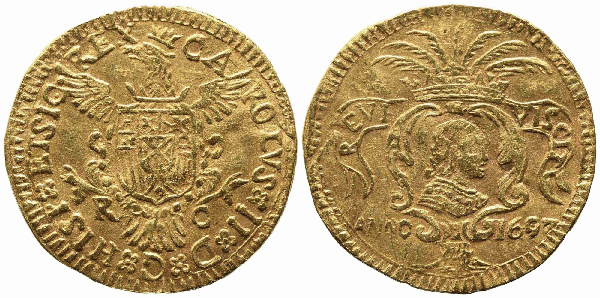 PALERMO. Regno di Sicilia. Carlo II di Spagna (1665-1700). Scudo Riccio 1697. Au (3,28 g). RR. Spahr 61/63; MIR 489. qSPL