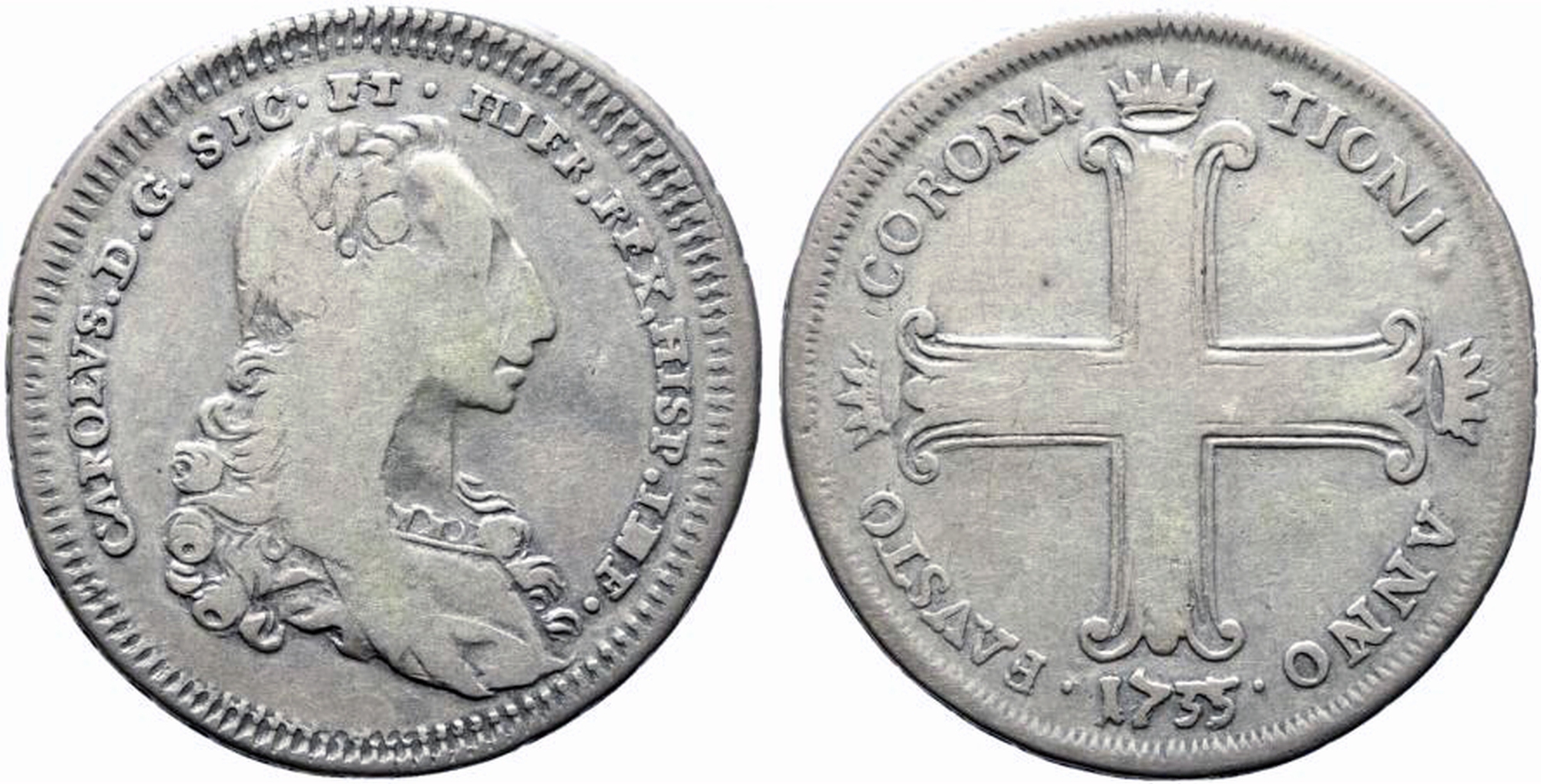 PALERMO. Regno di Sicilia. Carlo di Borbone (1734-1759). 6 tari 1735, senza sigle. Ag (34,8 mm – 13,15 g). Spahr 22 Gig. 35f. croce piena RR. MB+