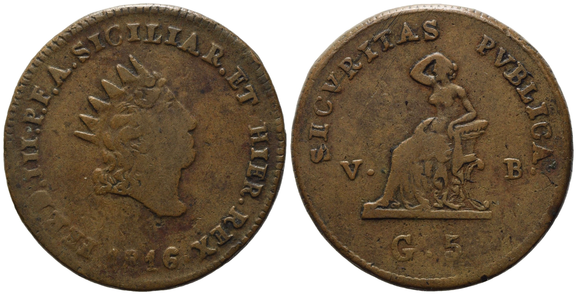 PALERMO. Regno di Sicilia. Ferdinando III di Borbone (1759-1816). 5 grani 1816. Cu. Gig. 89. RRR. MB/qBB