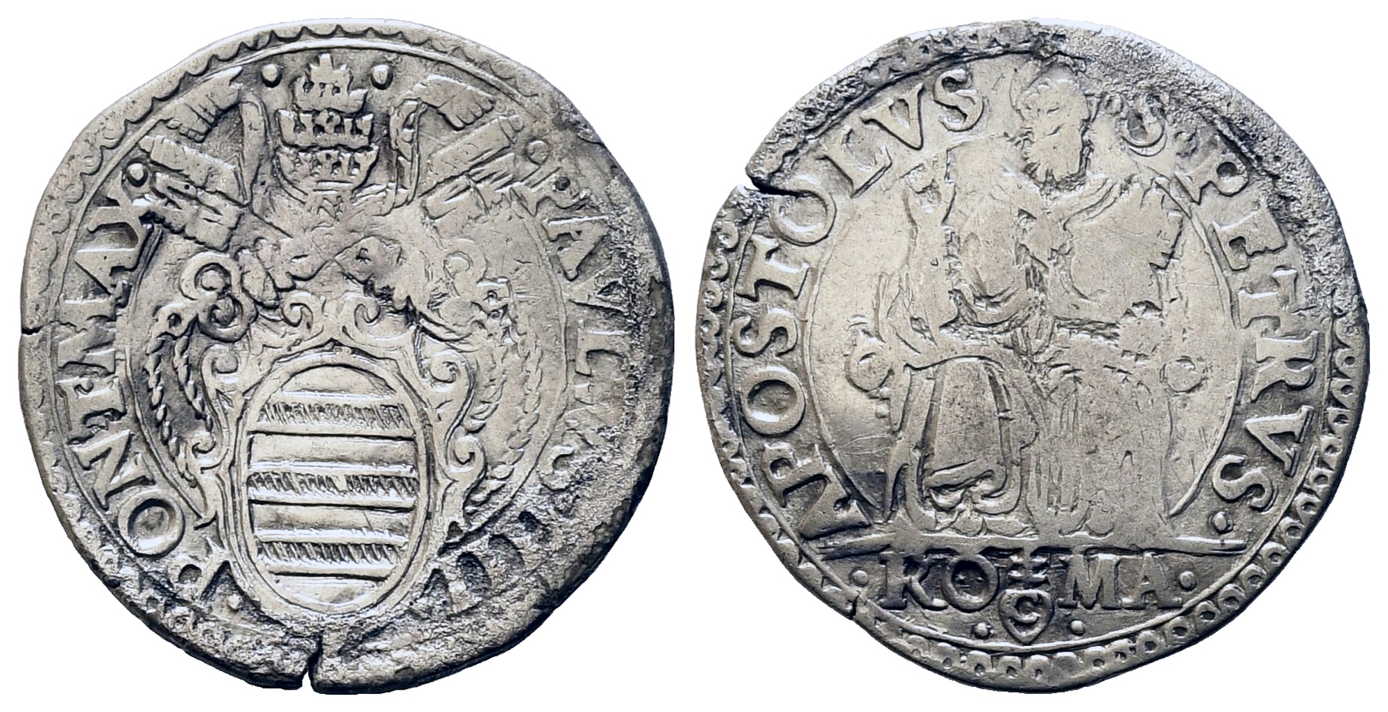 ROMA. Stato Pontificio. Paolo IV (1555-1559). Testone. Ag (9,44 g). PAVLVS IIII PONT MAX, stemma ovale sormontato da chiavi decussate con doppi cordoni, e triregno. R/ S PETRVS APOSTOLVS da ds. a sn., S. Pietro in trono, nimbato, benedicente con la destra e le chiavi erette nella sinistra; esergo, RO (simbolo Girolamo Ceuli, zecchiere) MA. Munt. 10; CNI 73, Berm. 1039. R. BB