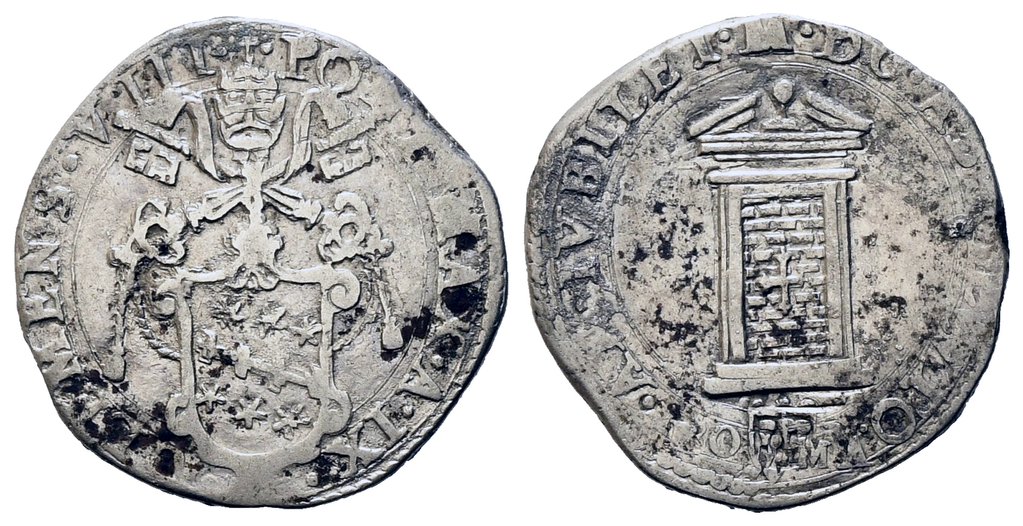 ROMA. Stato Pontificio. Clemente VIII (1592-1605). Testone A/ IX. Ag (9,27 g). CLEMENS·VIII·PONT·MAX·A·IX·. Stemma ovale in cornice sormontato da chiavi decussate e triregno. R/ AN·IVBILEI·MDCA·SOLVTO Porta Santa chiusa. Munt. 12, CNI 113. R. BB