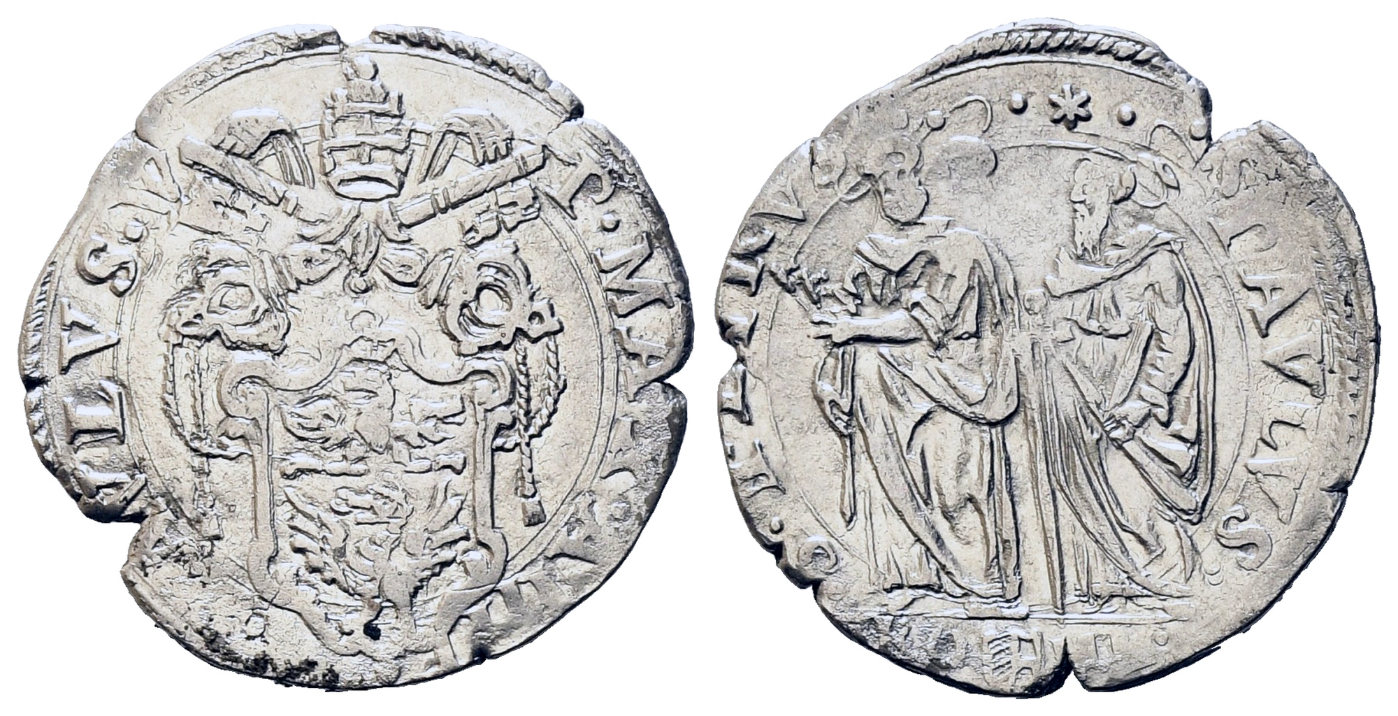 ROMA. Stato Pontificio. Paolo V (1605-1621). Testone A/ IV. Ag (9,46 g). ·PAVLVS·V P·MAX·A·IIII. Stemma a targa sormontato da chiavi decussate e triregno. R/ S·PETRVS· * ·S·PAVLVS·, SS. Pietro e Paolo stanti. Munt. 77; Berm. 1460. qSPL