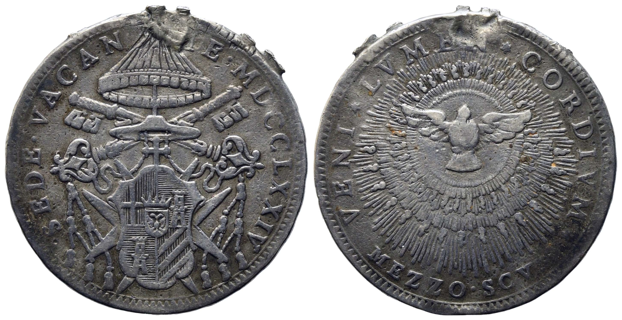 ROMA. Stato Pontificio. Sede vacante 1774. Mezzo scudo. Ag. MB. Montatura divelta.
