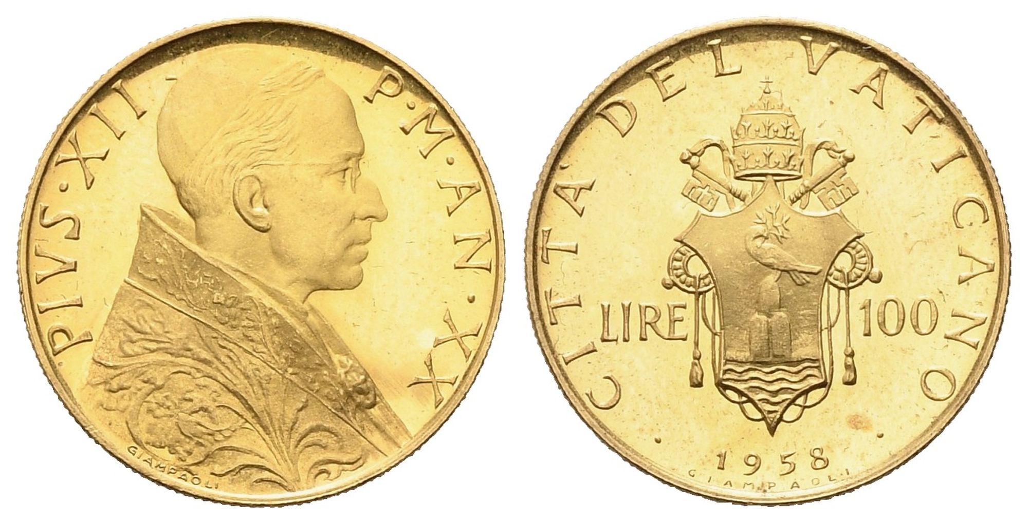 CITTA' DEL VATICANO. Pio XII (1939-1958). 100 lire 1958. Au (5,20 g). Gig....